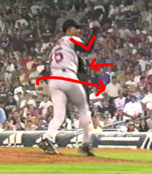 ↑ペドロのフィニッシュ。後ろ脚が前脚をクロスするように出て、一塁側に着地。この時、グラブ腕はまだ体の前に残っており、投球腕の肘は伸びた反動で曲がり、ガッツポーズの位置に来る。(このフィニッシュの形を利用してガッツポーズを取る投手もいる)